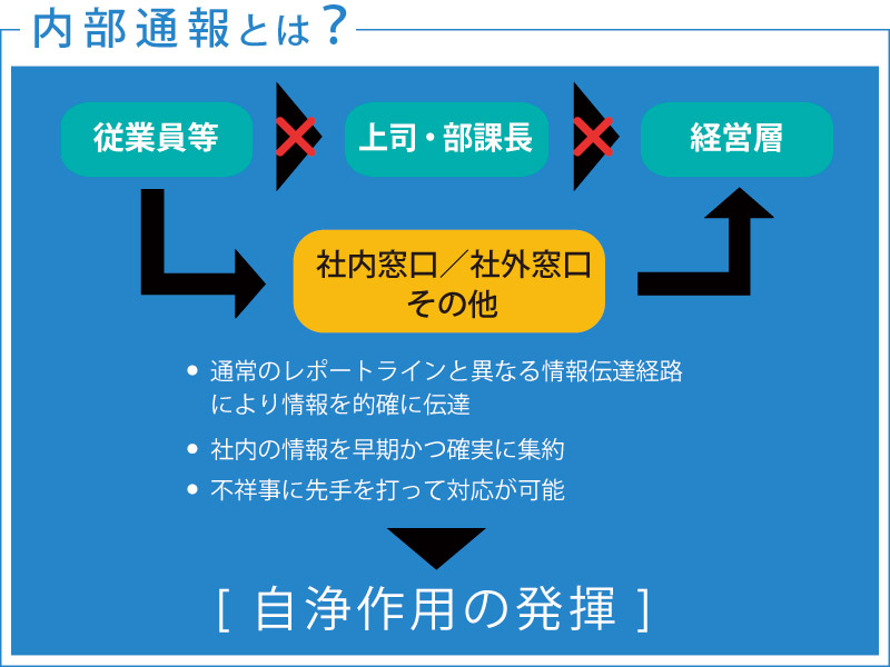 このような法令・倫理違反行為に対しては、まず企業内部で自浄作用を発揮させる必要があります。そのための重要な手段が、内部通報制度なのです。